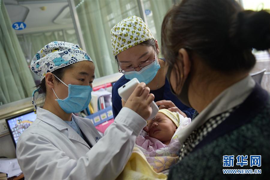 8月3日,拉萨市人民医院内,韩同英(左)在给新生儿做黄疸检测。