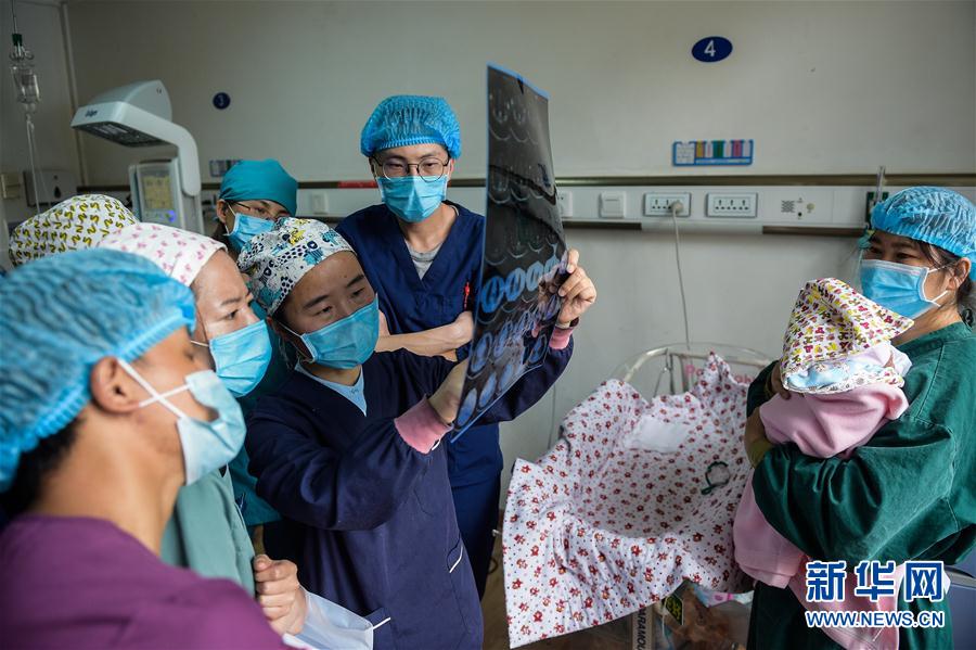 8月3日,拉萨市人民医院内,韩同英(手持胸片者)进行教学查房时,与“徒弟们”一起研究入院新生儿胸片。 新华社记者 彭子洋 摄