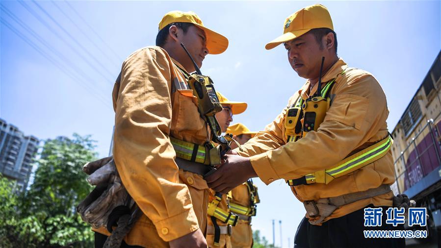 7月25日,在南宁车务段南宁南站调车场,调车员在相互检查安全带。 入伏以来,广西南宁市持续高温。南宁车务段南宁南站的调车员们头顶烈日,坚守岗位,保障每一列货运列车准确编组和安全开行。 新华社记者 张爱林 摄