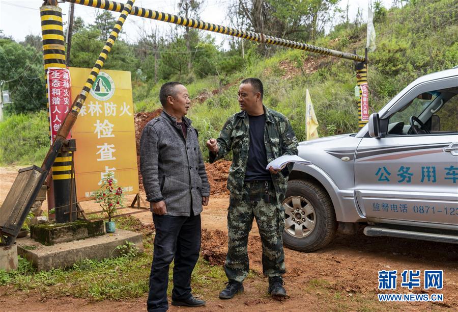 7月24日,经过林区森林防火检查点,夏卫春(右)下车登记并叮嘱值守人员加强检查。 新华社发 陈欣波 摄