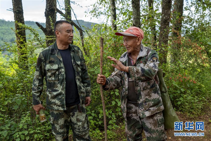 7月24日,夏卫春(左)在林区巡护时和一位老人攀谈。 新华社发 陈欣波 摄
