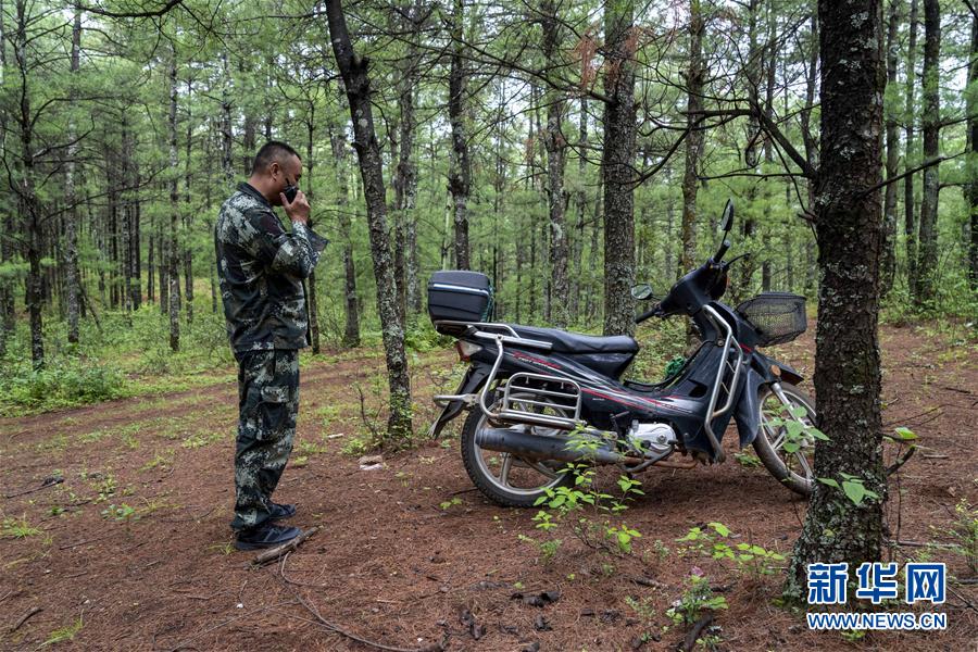 7月24日,夏卫春在林区巡护过程中发现一辆无人看管的摩托车,正通过对讲机和检查点核实。 新华社发 陈欣波 摄