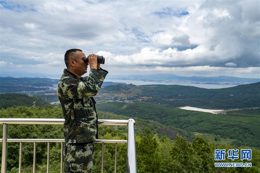 7月24日,夏卫春在瞭望台查看林区情况。 新华社发 陈欣波 摄