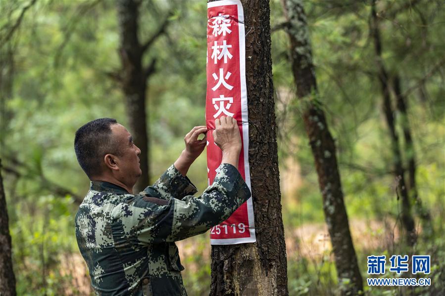 7月24日,夏卫春在林区加固一块森林防火宣传标语。 新华社发 陈欣波 摄