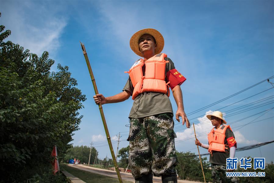 8月5日,夏德勤(左)与同事在长江武金堤上。新华社记者 肖艺九 摄