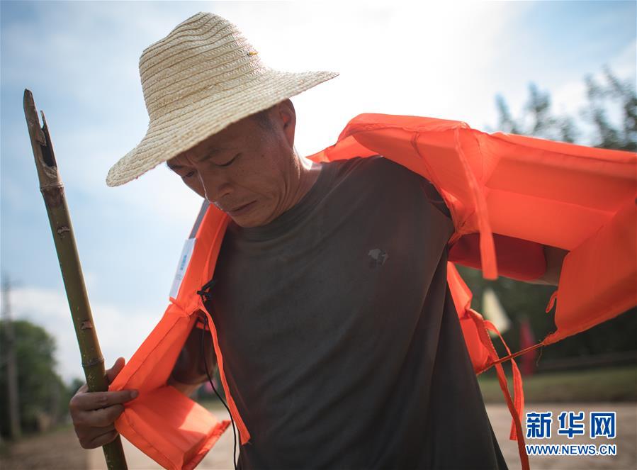 8月5日,夏德勤穿上救生衣准备去堤坝的迎水面巡查。新华社记者 肖艺九 摄