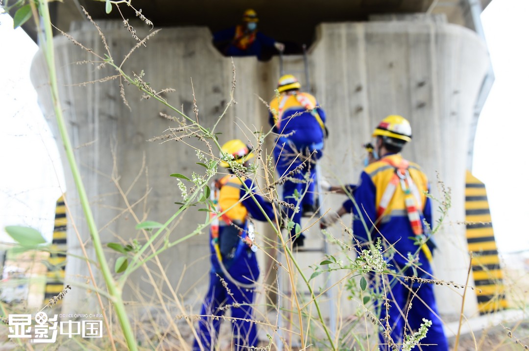 高铁大桥“肚子”里的维修工人