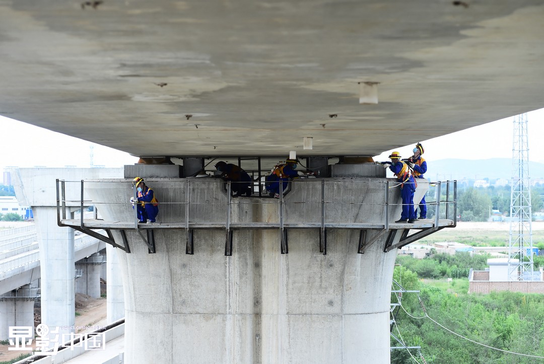 图为朝阳桥梁检查工区工人在对大桥墩台、支座、吊围栏等设施进行检查。新华网 姜冰摄