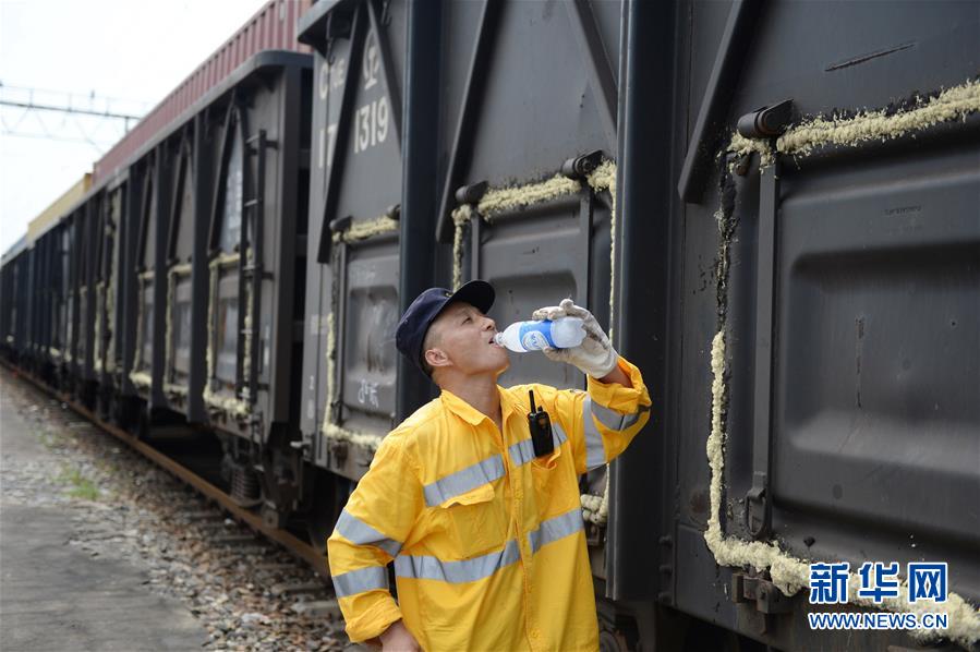 8月6日,合肥运用车间列车检修员在工作间隙喝水。 合肥市近日持续高温天气。在中国铁路上海局集团有限公司杭州北车辆段合肥运用车间,386名列车检修工人头顶烈日坚守岗位,确保暑运列车的安全运行。据了解,暑运期间,合肥运用车间日均检修列车105列,检修车厢5058节。 新华社记者 黄博涵 摄