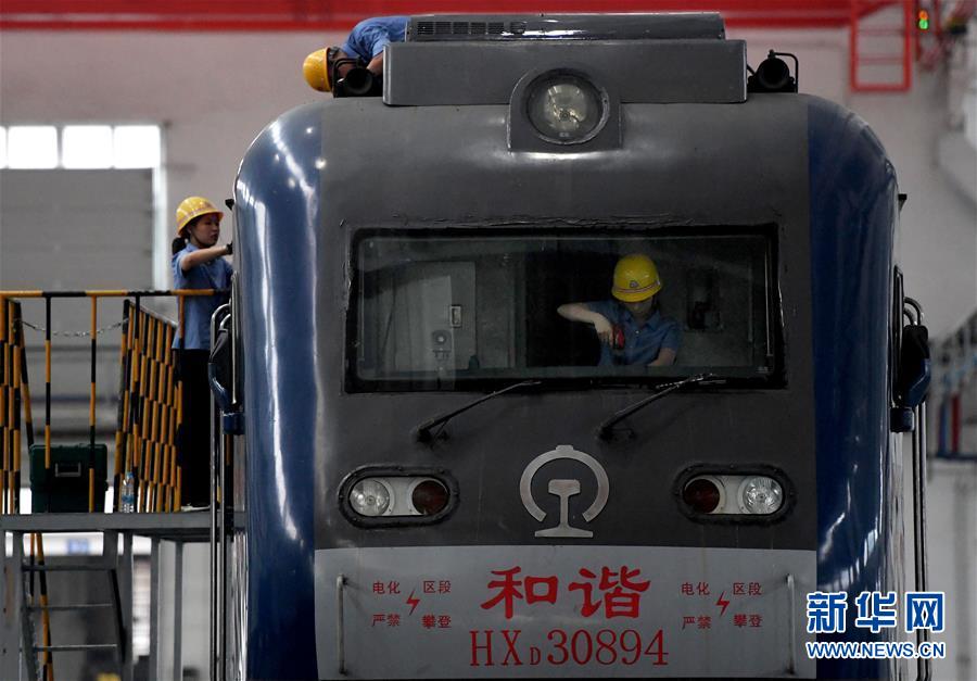在郑州机务段北检修车间,检修工人对机车进行检修作业(8月6日摄)。