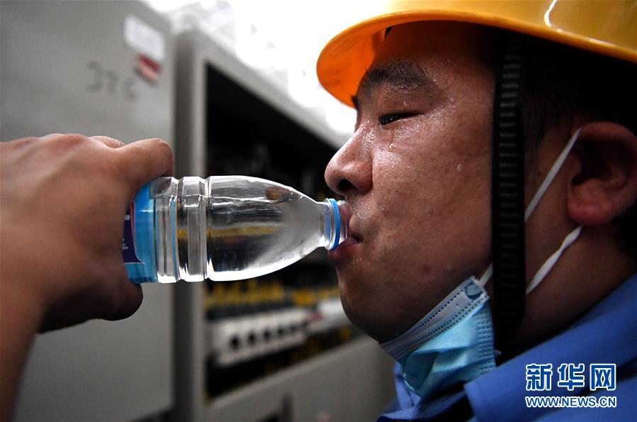 在郑州机务段北检修车间,检修工人贾楠在工作间隙喝水(8月6日摄)。新华社记者 李安 摄