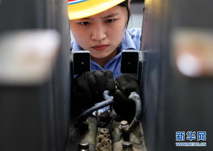 在郑州机务段北检修车间,检修工人褚梦婷在安装机车大顶盖中间接地线(8月6日摄)。新华社记者 李嘉南 摄