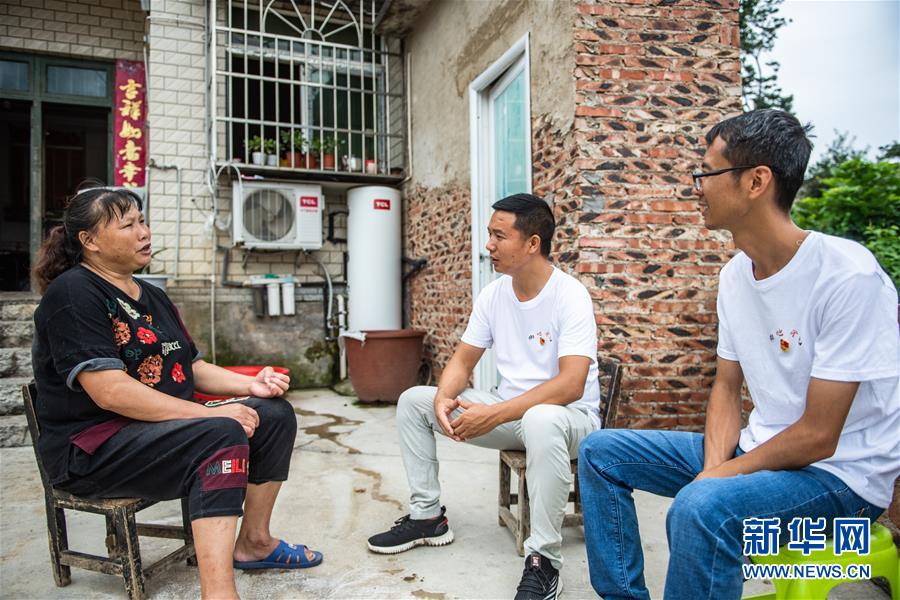 安顺市平坝区白云镇平元村党支部书记肖正强(中)到村民邱明凤家中走访(8月4日摄)。 新华社记者 陶亮 摄