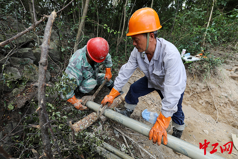 8月9日上午,浙江省舟山市定海区金塘岛西堠海岸边,工人师傅正头顶娇阳,在山坡上紧张地钻探着,为甬舟高速复线金塘至大沙段工程设计提取地质数据。(姚峰/视觉中国)