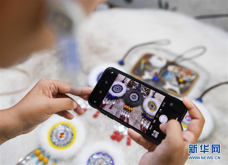 在内蒙古自治区鄂温克族自治旗巴彦托海镇太阳花传承发展中心,艾吉玛在拍摄手工艺品照片(8月7日摄)。新华社记者 刘磊 摄