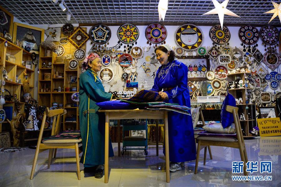 在内蒙古自治区鄂温克族自治旗巴彦托海镇太阳花传承发展中心,脱贫户敖登图雅(左)向乌仁交付自己制作好的手工艺品(8月6日摄)。新华社记者 徐钦 摄