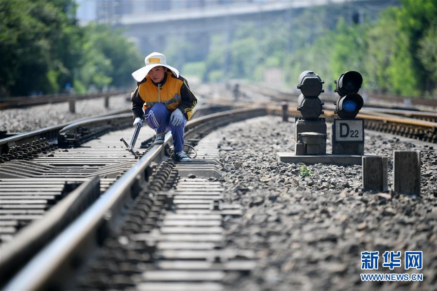 8月10日,西安铁路局西安工务段咸阳线路车间检查工区“女子检查组”的马小英在咸阳车站进行作业。 新华社记者 李一博 摄