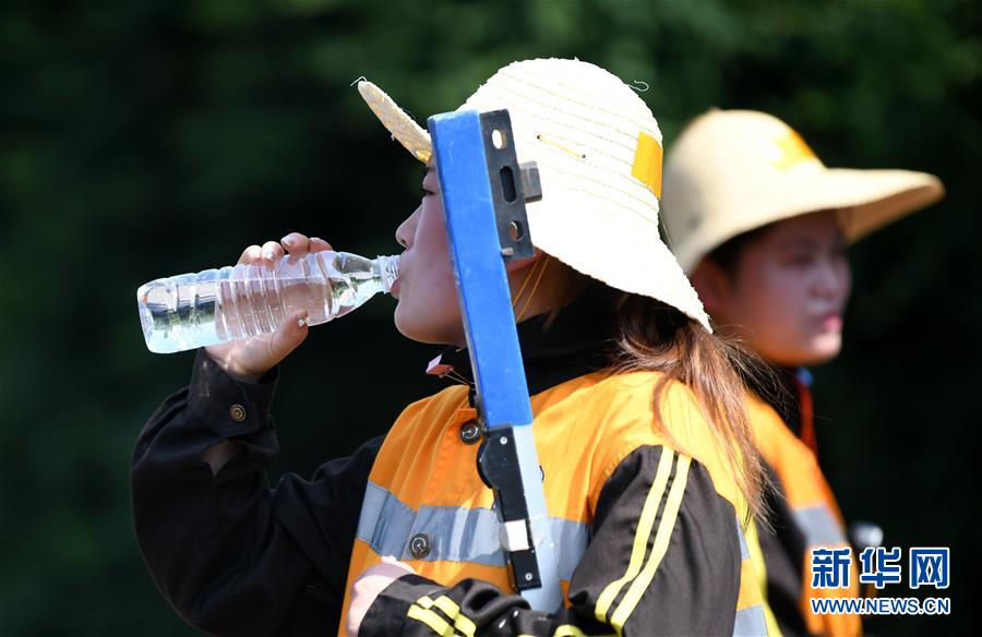 8月10日,西安铁路局西安工务段咸阳线路车间检查工区“女子检查组”的王冬在工作间隙补水。 新华社记者 李一博 摄