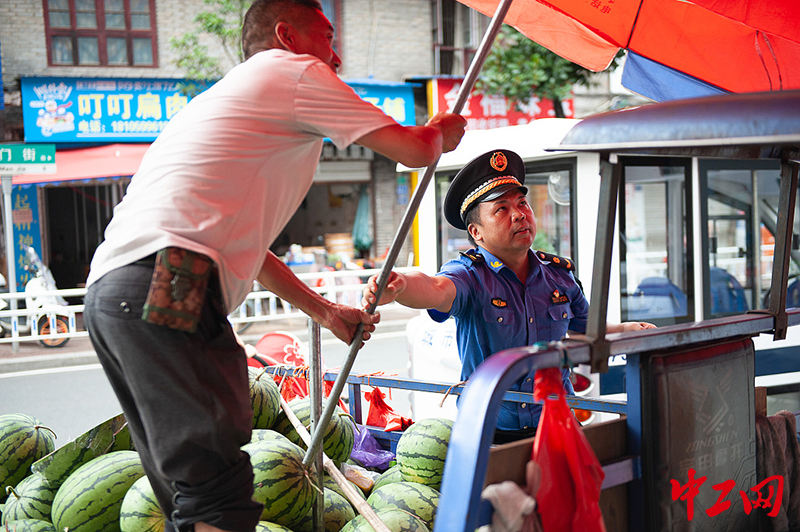 8月10日,福建南平,武夷山北大街,城管工人员顶着高温正在对沿街商贩进行劝导。(伊凡/视觉中国)
