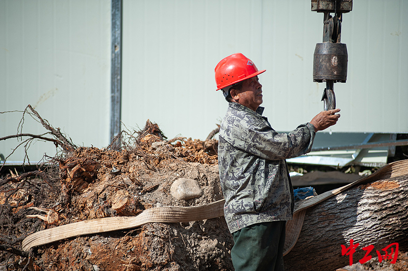 8月10日,福建南平,武夷山老城区五九路改造升级项目,吊车工人正顶着高温在对原有道路两侧的香樟进行移摘。(伊凡/视觉中国)