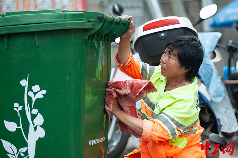 8月10日,福建南平,在武夷山西门头,环卫工人顶着高温正在对垃圾桶进行保洁。(伊凡/视觉中国)