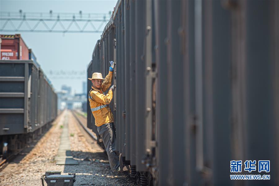 8月11日,调车员王东在车厢上进行调车作业。 当日,浙江杭州的最高气温超过37摄氏度。在杭州北郊的铁路乔司编组站,调车员们顶着骄阳作业。他们将一节节车厢重新编组,发向目的地,用自己的辛勤汗水,保障着铁路大动脉的顺畅运转。 新华社发(江汉 摄)