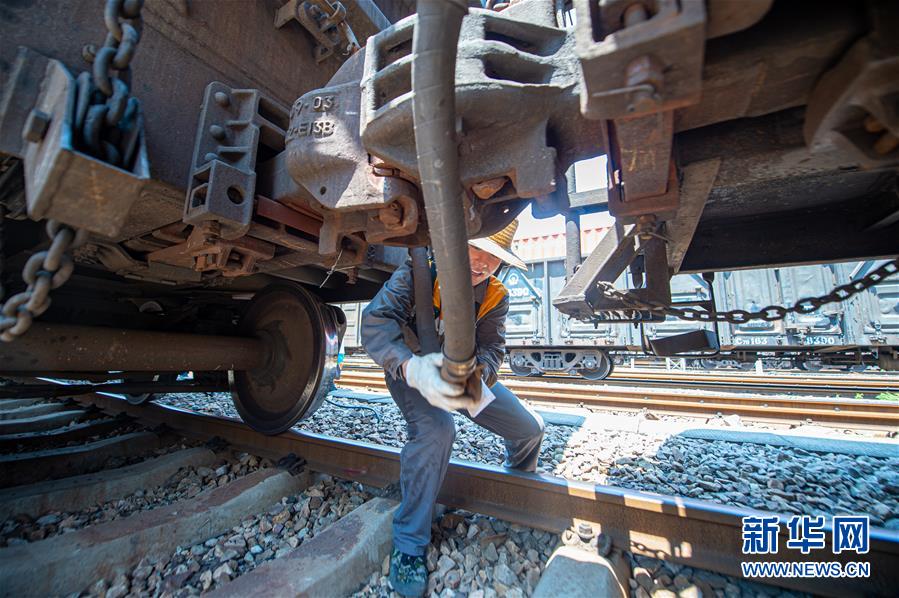 8月11日,调车员陈翀连接制动风管。 当日,浙江杭州的最高气温超过37摄氏度。在杭州北郊的铁路乔司编组站,调车员们顶着骄阳作业。他们将一节节车厢重新编组,发向目的地,用自己的辛勤汗水,保障着铁路大动脉的顺畅运转。 新华社发(江汉 摄)