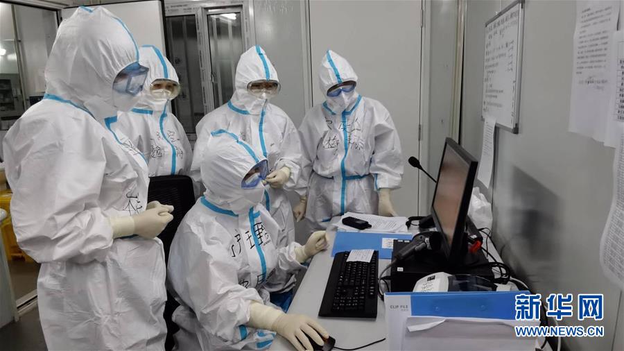 仲月霞(坐者)担任武汉火神山医院护理部副主任时,检查护理工作质量(3月12日摄)。新华社发(王传顺 摄)