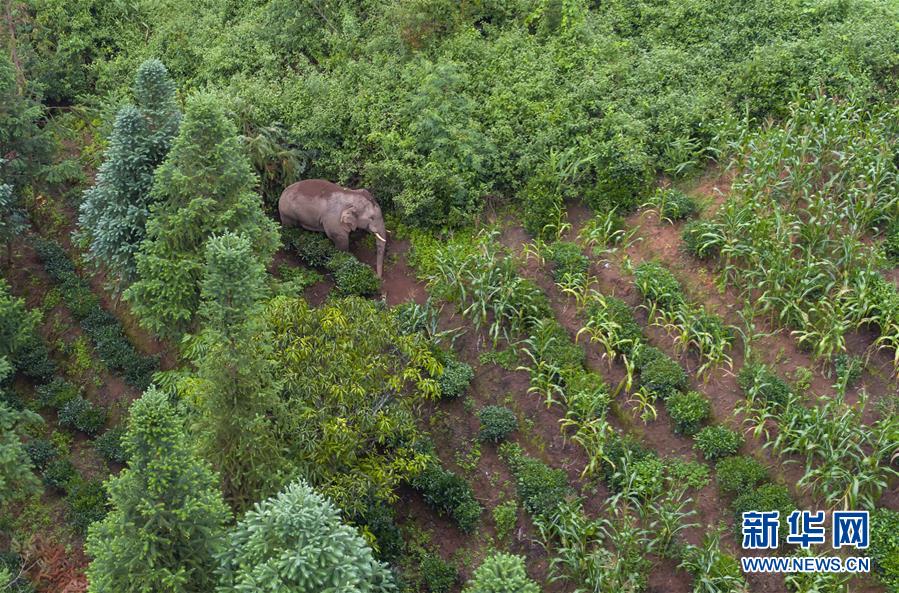 8月9日上午,一头野生亚洲象在一座山上的玉米地里活动(无人机照片)。