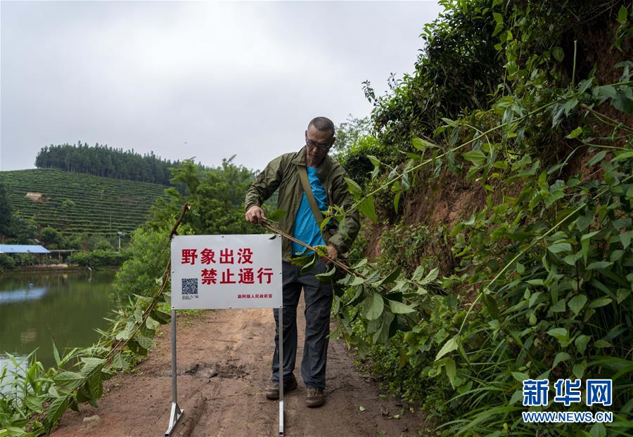 8月9日上午,普宗信在野生亚洲象活动区域一个路口处设置警示牌。 新华社发(陈欣波 摄)
