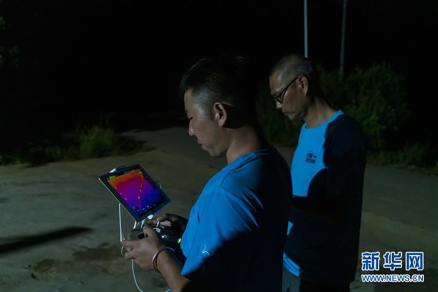 8月8日晚,普宗信(右一)和同事向志杰通过无人机及安装的红外相机搜寻野生亚洲象。 新华社发(陈欣波 摄)