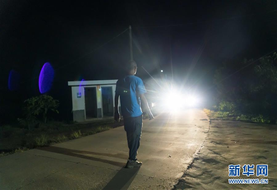 8月8日晚,普宗信在拦截一辆即将通过野生亚洲象活动区域的汽车并告知驾驶员野象活动情况。新华社发(陈欣波 摄)