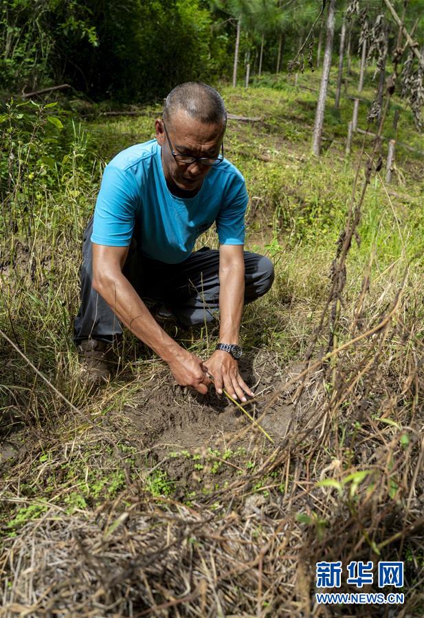 8月8日下午,普宗信在测量一头野生亚洲象的脚印。 新华社发(陈欣波 摄)