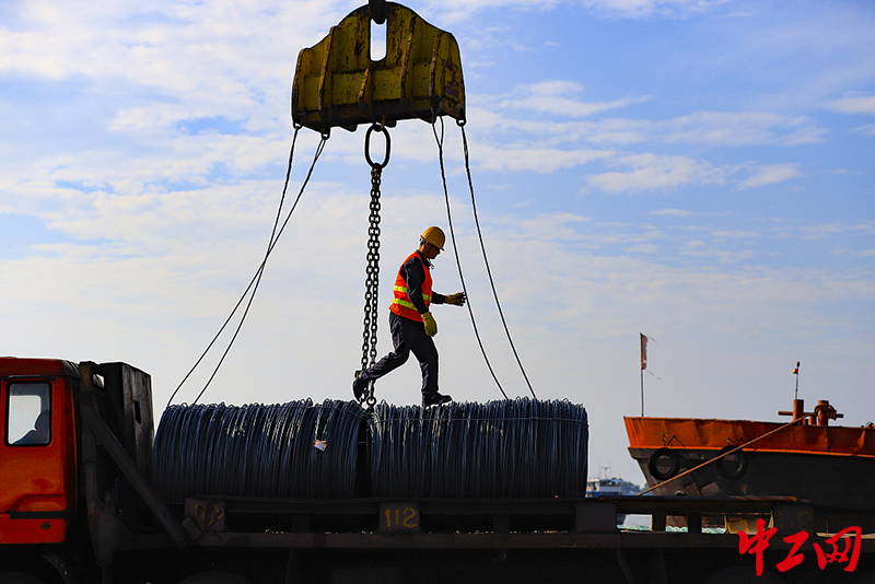 8月11日,江西九江,湖口县高新技术产业园区内的方大九钢公司码头工人正头顶烈日,有序进行出厂钢材外销装船作业,呈现一派繁忙景象。(张玉/视觉中国)