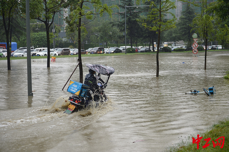 8月11日,成都,受暴雨影响,市区部分道路积水被淹,在三环交大立交附近,外卖小哥骑着电动车涉水而行,跌倒了又爬起来继续前行。(高寒/人民视觉)