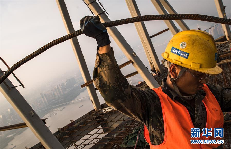 8月11日,工人在武汉绿地中心项目建设现场近500米的高空施工。 新华社记者 肖艺九 摄