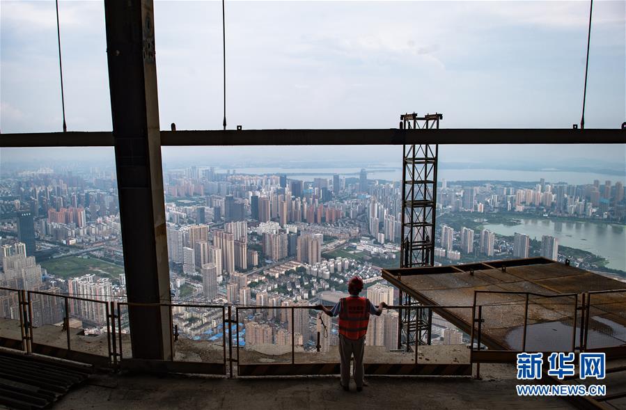 8月11日,一名工人在武汉绿地中心项目建设现场近500米的高空远眺。 新华社记者 肖艺九 摄