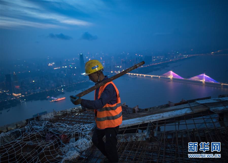 8月11日傍晚,工人在武汉绿地中心项目建设现场近500米的高空施工。 新华社记者 肖艺九 摄