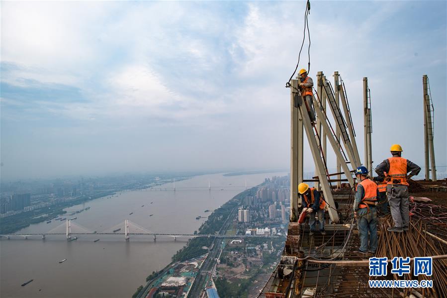8月11日,工人在武汉绿地中心项目建设现场近500米的高空施工。 新华社记者 肖艺九 摄