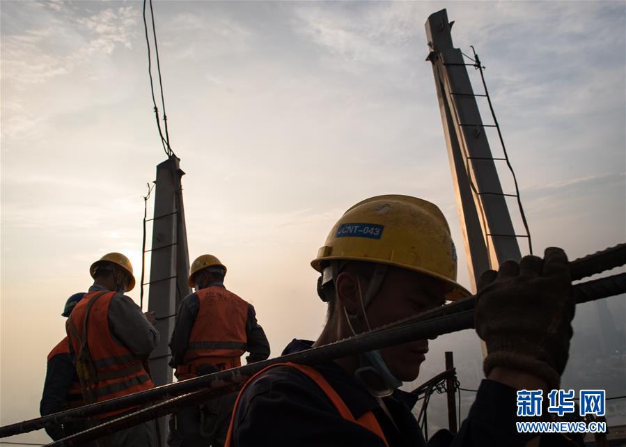 8月11日,工人在武汉绿地中心项目建设现场近500米的高空施工。 新华社记者 肖艺九 摄