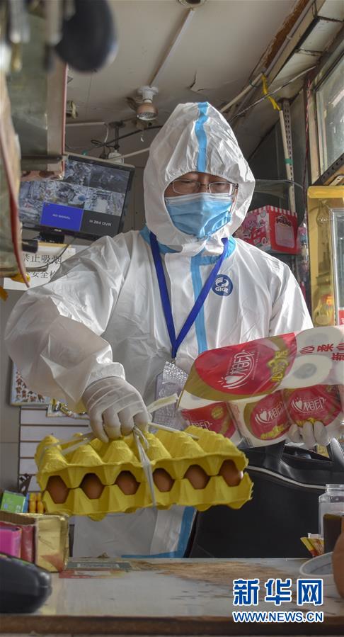 8月12日,乌鲁木齐市天山区山西巷社区工作人员王志鹰帮居民代购生活用品。 新华社记者 高晗 摄