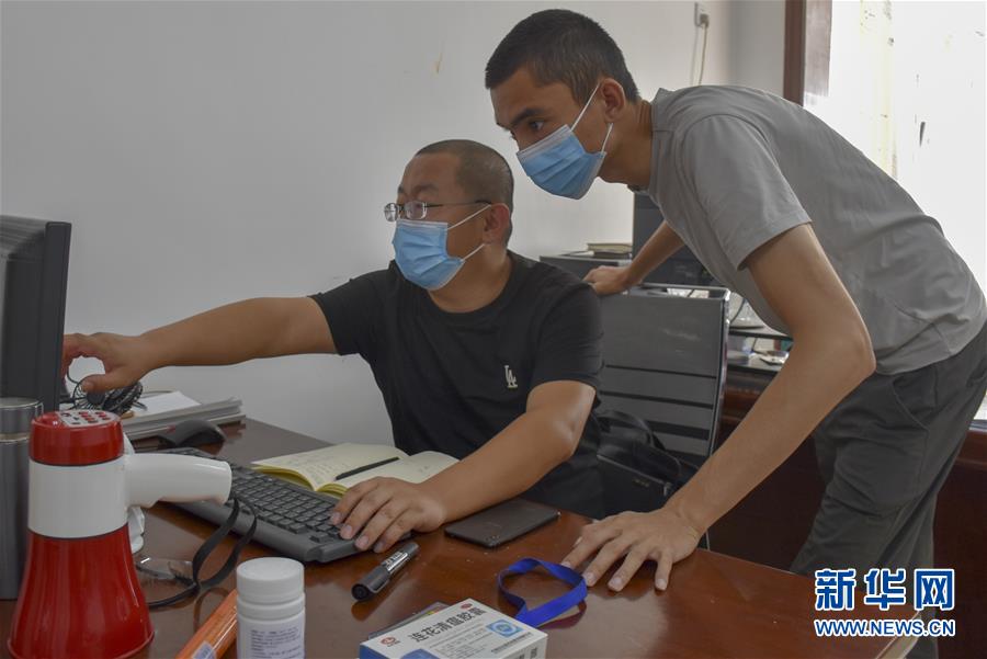 8月12日,乌鲁木齐市天山区山西巷社区工作人员王志鹰(左)与同事沟通工作事宜。 新华社记者 高晗 摄