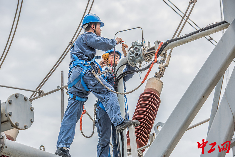 电力工人冒着高温在大型变压器顶部认真做电压测试。(何华文/视觉中国)