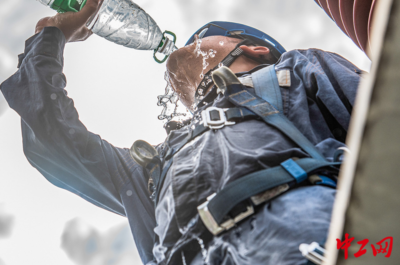 作业员莫佳林利用工作间隙,大口喝上矿泉水补充水分,继续工作。(何华文/视觉中国)