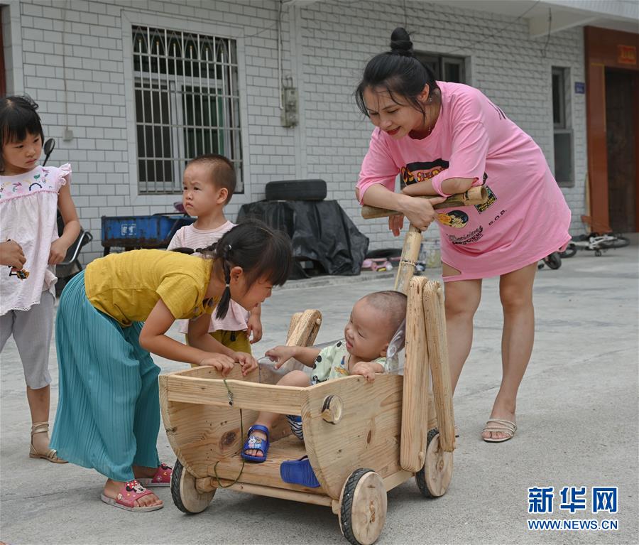 8月12日,在福建省龙岩市长汀县新桥镇新桥村,李石水的儿媳黄凤杏用“螳螂车”推着蛋蛋出行,吸引了同村小朋友围观。 新华社记者 宋为伟 摄