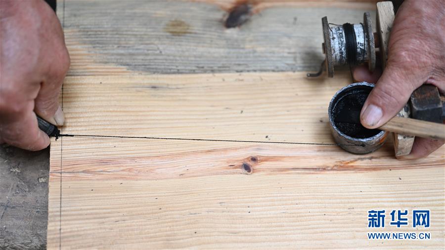 8月12日,在福建省龙岩市长汀县新桥镇新桥村,李石水用墨线为木板划线。 新华社记者 宋为伟 摄