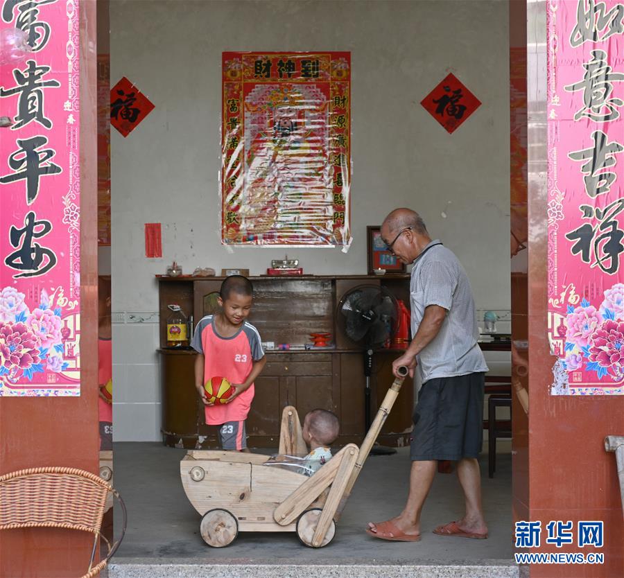 8月12日,在福建省龙岩市长汀县新桥镇新桥村,李石水在家中用“螳螂车”推孙子。 新华社记者 宋为伟 摄