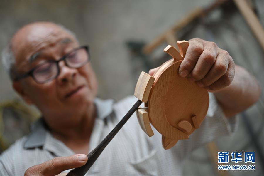 8月12日,李石水在家中调试木制玩具——“自走”小鸟。 新华社记者 宋为伟 摄