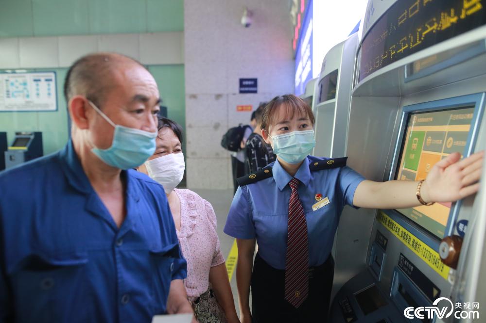 综控室除了要不断接收新的命令,还要和行调室密切联系,核对每日开行的各车次列车的广播信息、检票口信息、正晚点信息等;掌握现场设备设施情况及作业情况,如闸机状态是否正常、检票员是否已经提前到检票口、站台上是否还有未及时出站的旅客等;此外,还需要播放服务类广播,如旅客寻找遗失物品、广播寻人等。图为付薪宇帮助老年旅客使用自动售票机购票。