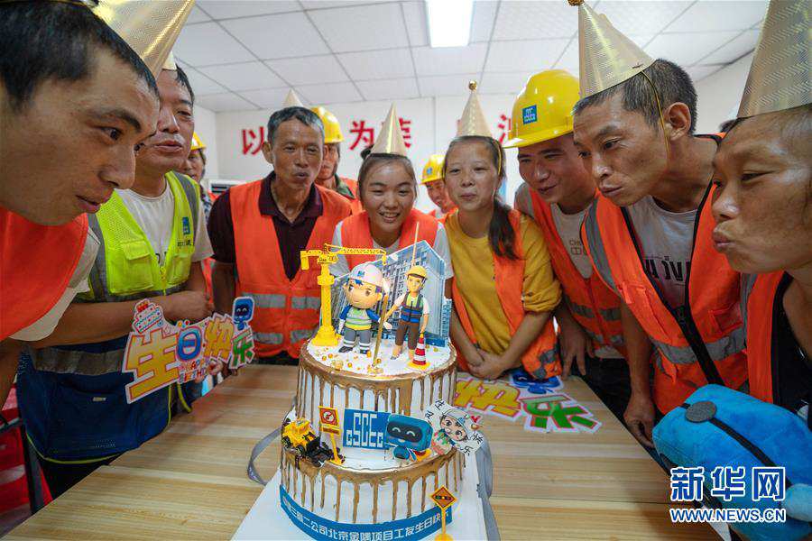 8月15日,在北京市大兴区中建三局二公司北京公司金隅X89、X90项目部食堂,参加集体生日会的工友一起吹生日蜡烛。当日,中建三局二公司北京公司金隅X89、X90项目部为第三季度过生日的工友组织集体生日会。连日来,这些项目部的工友们冒着高温天气,始终坚持在工地现场施工作业。 新华社记者 才扬 摄